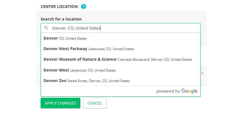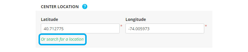 In the Center Location section, click the “Or search for a location” button below the latitude and longitude coordinates.