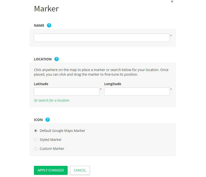The Markers section includes a Name, Location, and Icon style that can be used to add custom locations to your map. We could add markers for a home, favorite restaurants, wedding location, etc., to add an additional level of personalization.