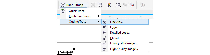 Next, we’ll convert the raster image to a vector graphic using the Line Art settings in the Trace Bitmap feature. With the map selected, click Trace Bitmap, near the top of the screen in the Property Bar, then Outline Trace, and then Line Art as the style of trace.
