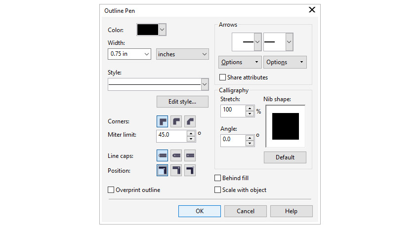 Next, click the Outline Pen tool in the bottom right corner of CorelDRAW, then change the Line Width to .75” and next to Position select Inside Position this time, then click OK.