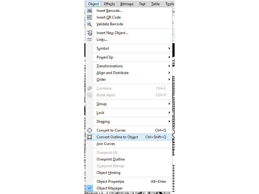 Now convert the line to an Object by clicking Object, then Convert Outline to Object (Ctrl + Shift + Q) in the drop-down menu.