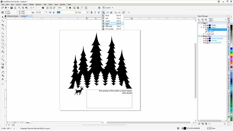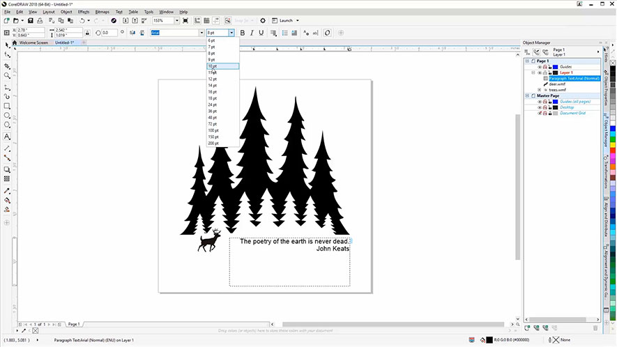 Before we move on let’s make the text box a little smaller. Select the Pick Tool, then click on the text box. Now click on the bottom middle sizing handle and drag it up to make the text box a little smaller.