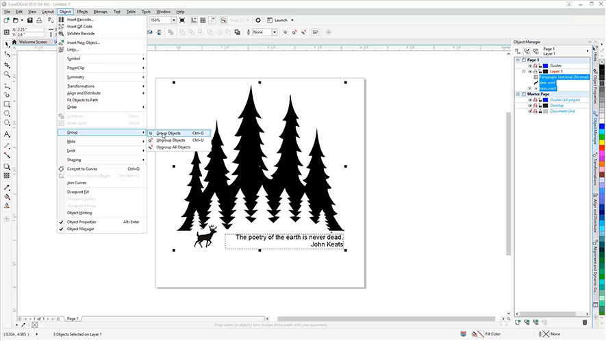 Next we’ll group the items so they all stay together when we make changes. Click Object in the menu bar, then Group, then Group Objects.