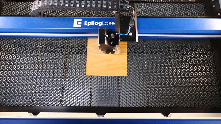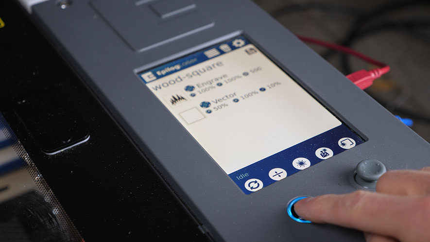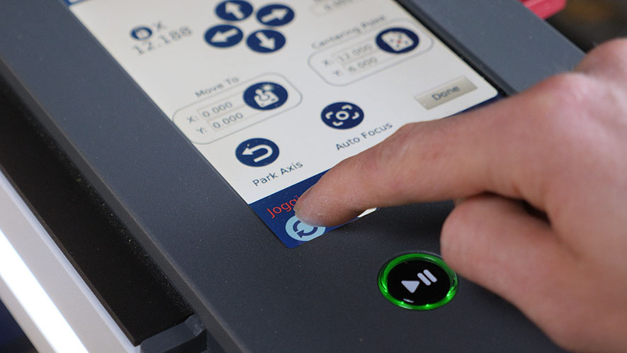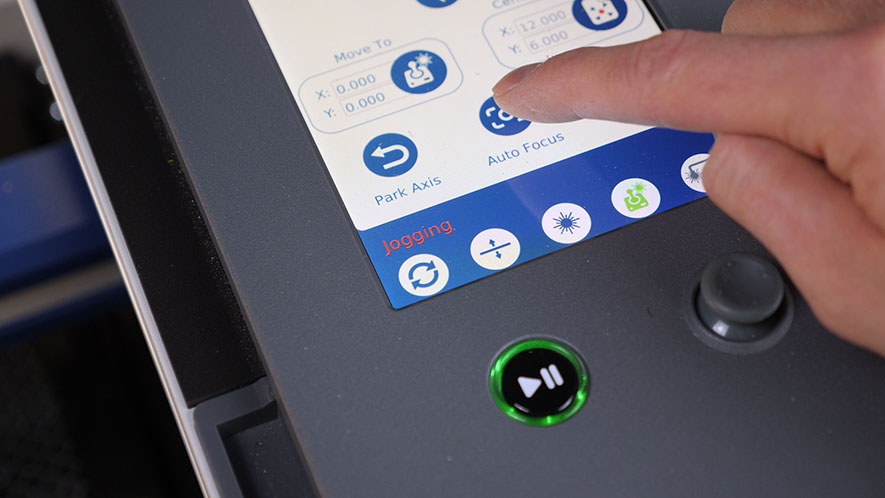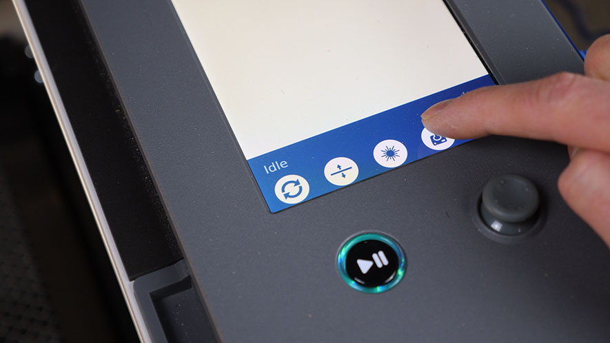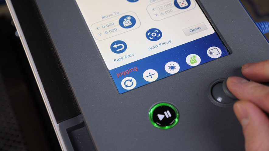 At the control panel, select the Jog icon, then use the Joystick to position the laser head over the wood square.