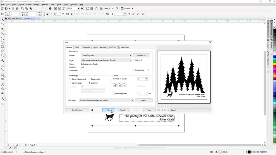 Set Epilog Engraver as your printer, and make sure “Match orientation and size” is selected as the Page setting. Then click the Print button.