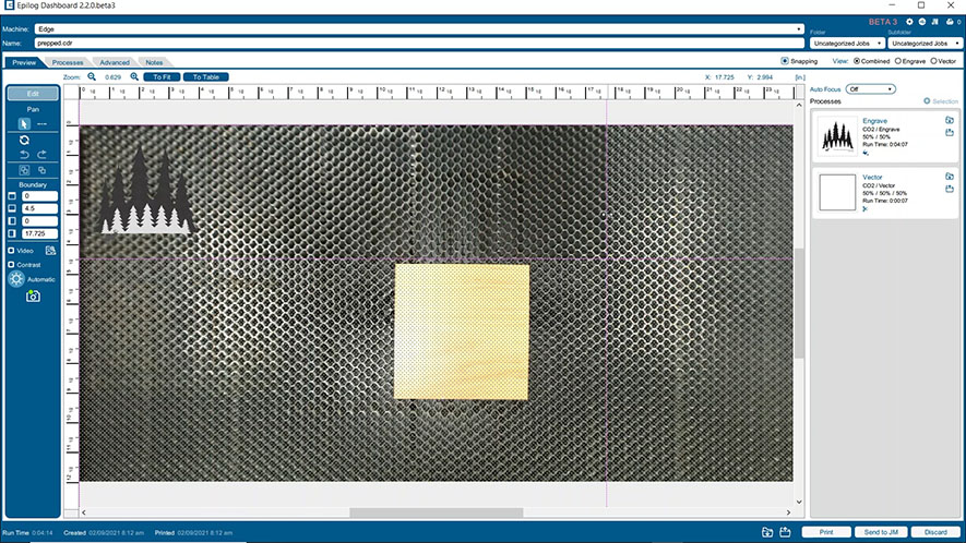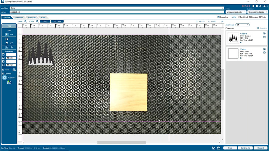 The Epilog Dashboard will open with our file and the IRIS camera feed.
