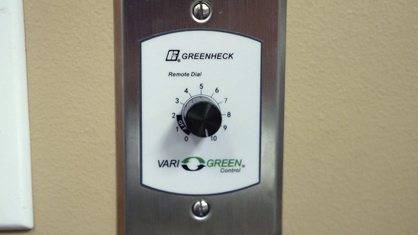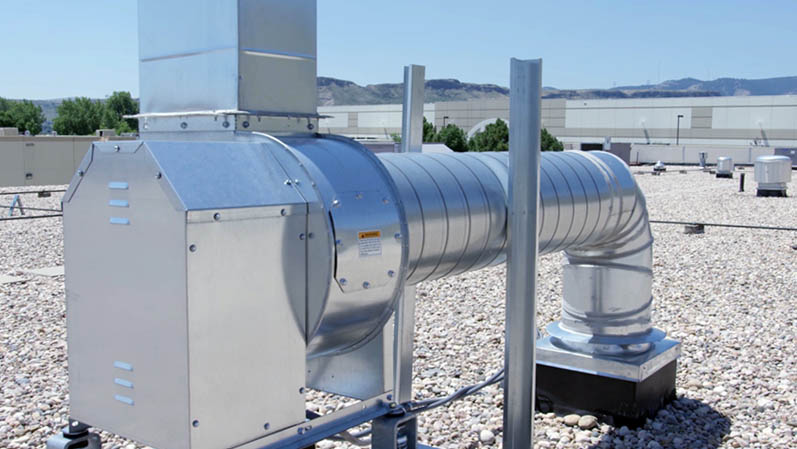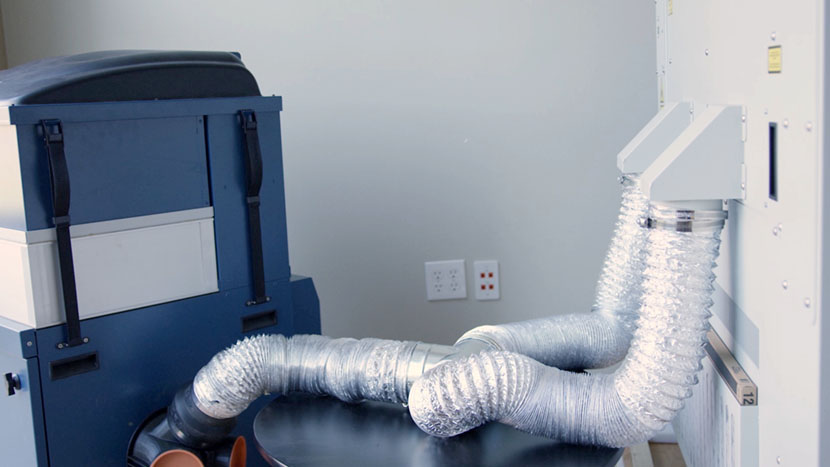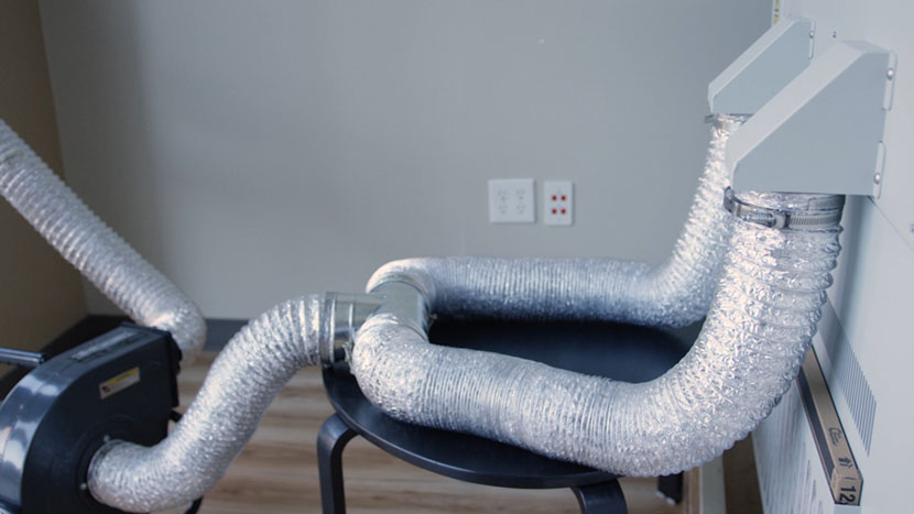 We suggest putting the exhaust blower outside with an electrical switch near the machine to turn on and off the blower.