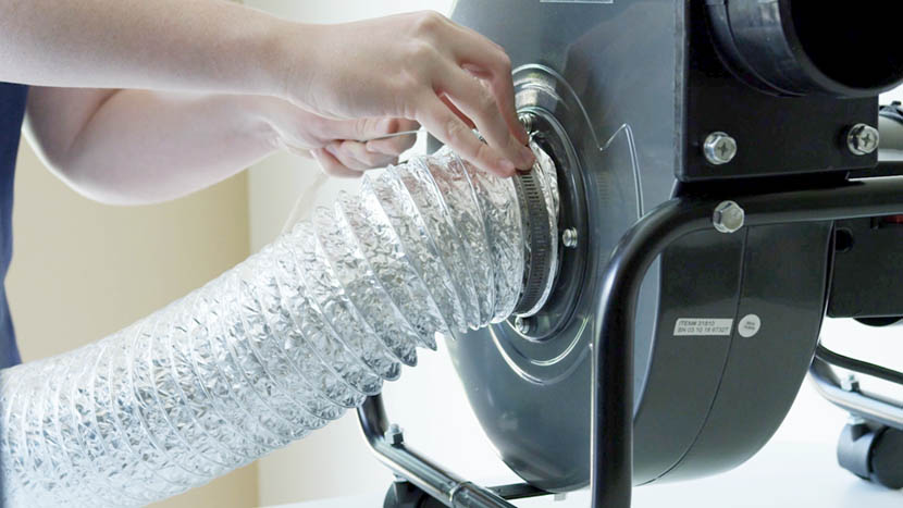 Next, connect another exhaust hose to the out-take port of the blower and the other end to a wall vent or window.