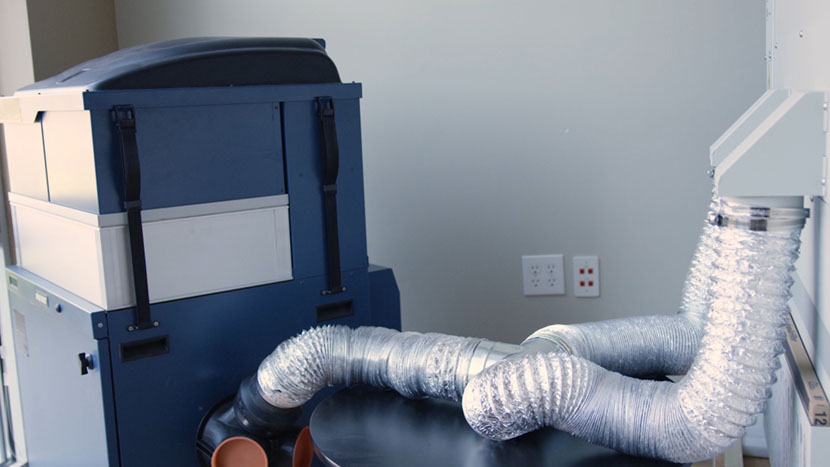 We suggest putting the exhaust blower outside with an electrical switch near the machine to turn on and off the blower.