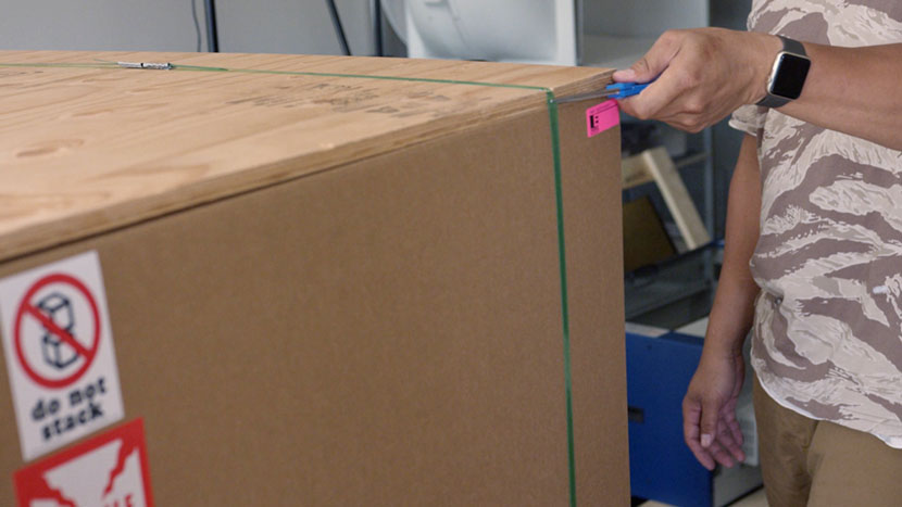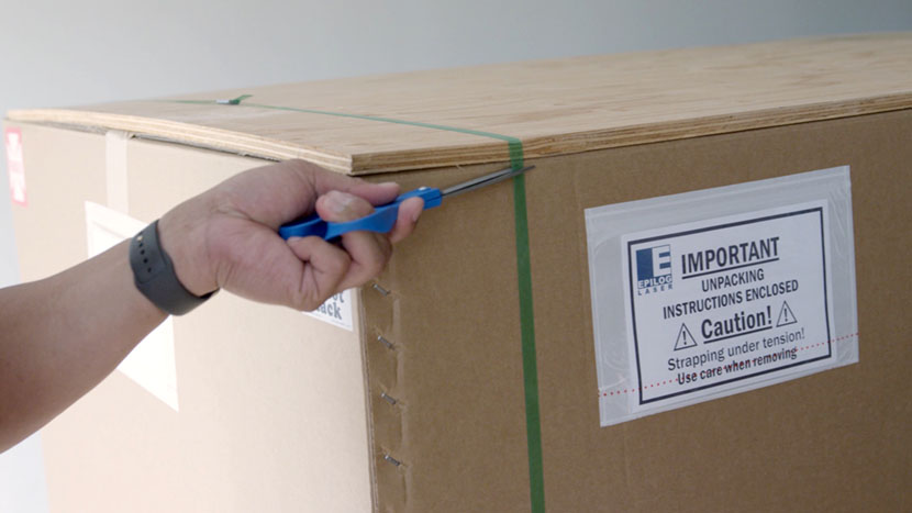 Start by using scissors or a utility knife to cut the box straps. Stand clear of the straps, as they are under high tension and may pop out at high speed when cut.