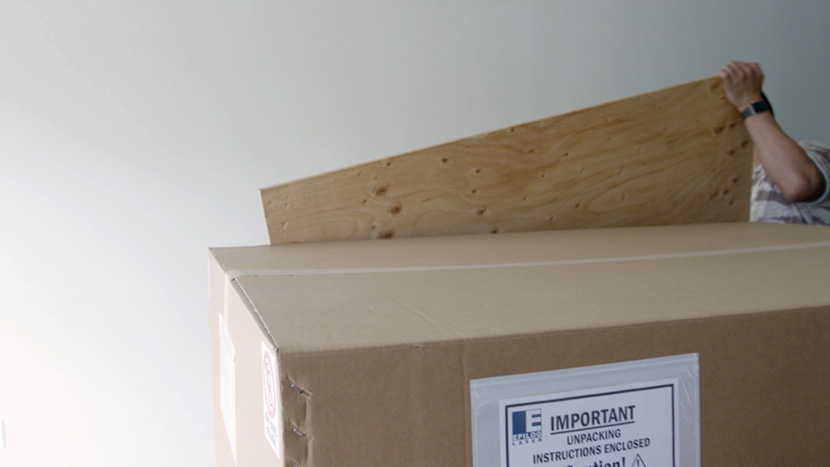 Remove the straps and the wooden box topper. Then lift and remove the cardboard box.