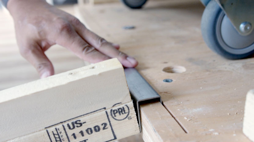Unscrew and remove the raised wooden edge located on one side of the pallet.