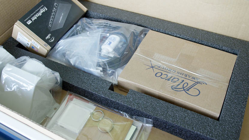 Open your Fusion M2 laser system’s top door, and remove the included items from the cabinet, then open the box of included items.