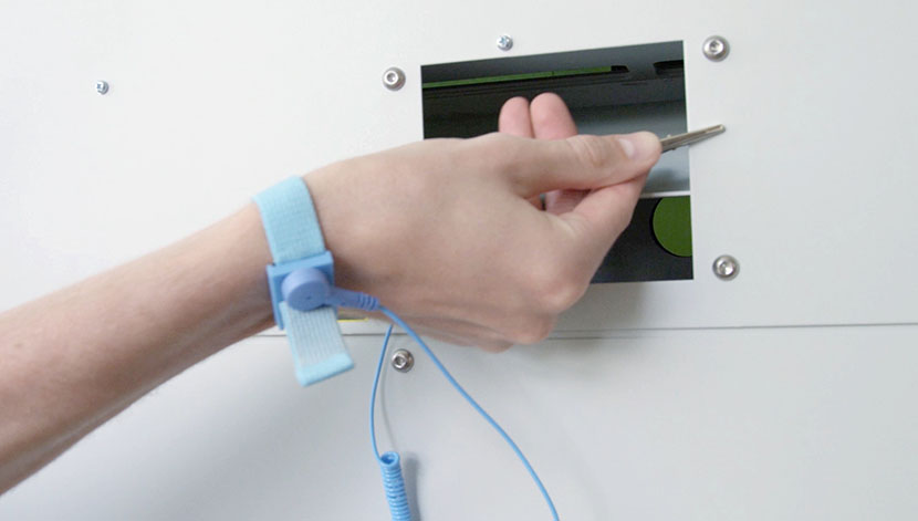 Put on the anti-static wrist strap. Always wear the anti-static strap when handling the control board to avoid damaging the unit through static discharge. Clip the strap on to a metal part of the machine, other than the control board itself, as far away from the control board as the strap’s length will allow.