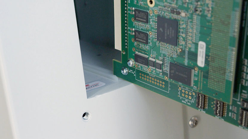 Grasp the flanges at the top and bottom of the control board panel, then pull the assembly out and set it aside. Be sure that you are still grounded to the machine via the anti-static wrist strap.