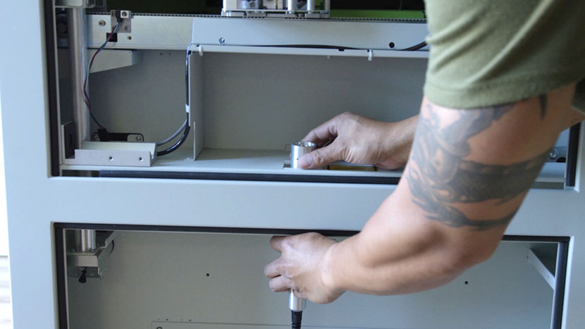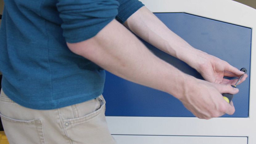 Use a 5/32” hex key to insert the hex screws that secure the lower panel to the rear of the machine.