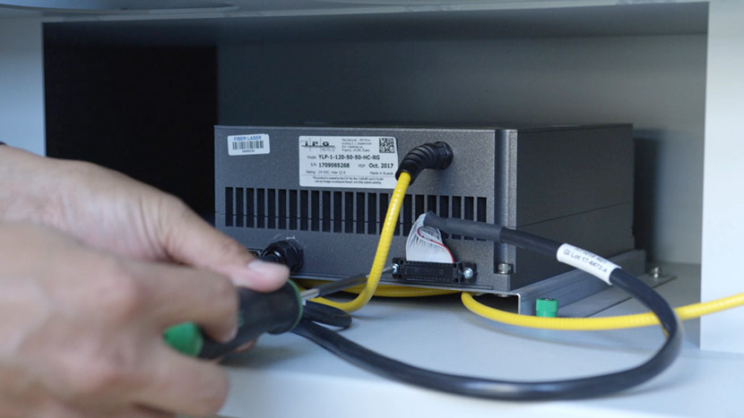To install the new fiber laser tube, place the laser tube in the bottom compartment and align the front captive screws with the screw holes in the chassis.