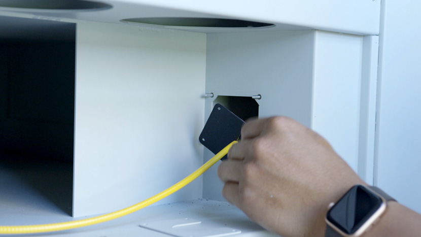 Feed the laser head through the hole in the right side of the compartment, then up through the hole in between the two compartments on the left side of the machine.