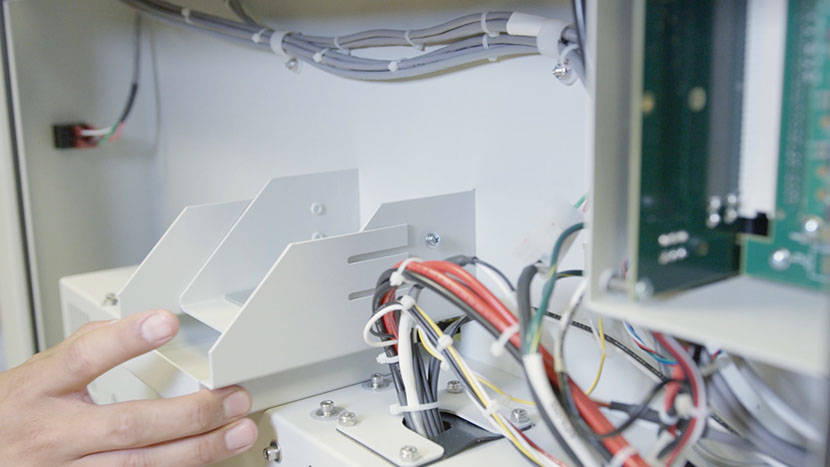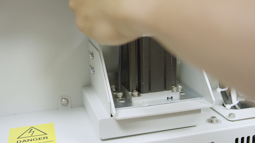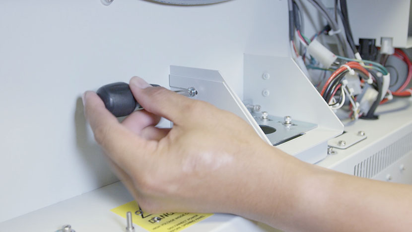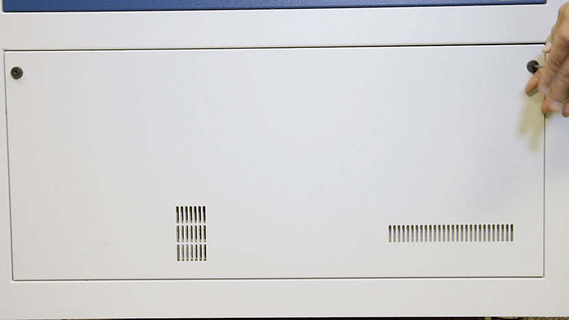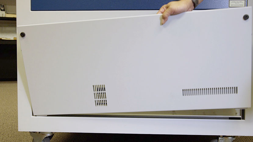 Remove the bottom access panel on the right side of the machine by using a 5/32” hex key to turn the black panel locks ¾ of the way counter-clockwise.