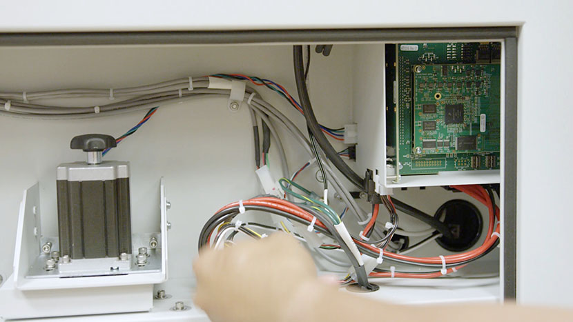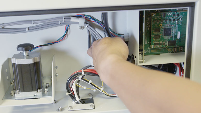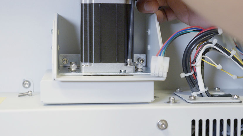 Disconnect the white connector that attaches z-motor to the machine’s control board housing.