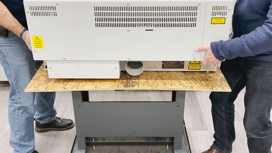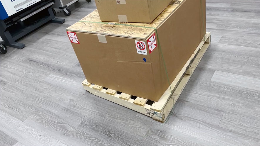 With the help of an additional person, lift your Fusion Edge laser system from the pallet and place it on a sturdy, level surface.