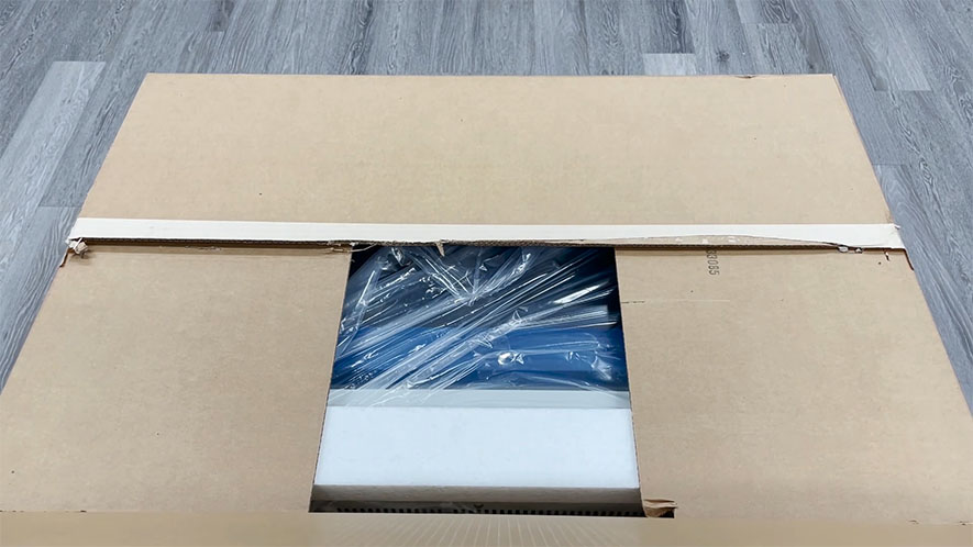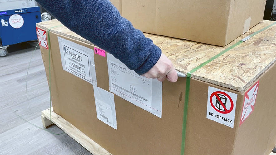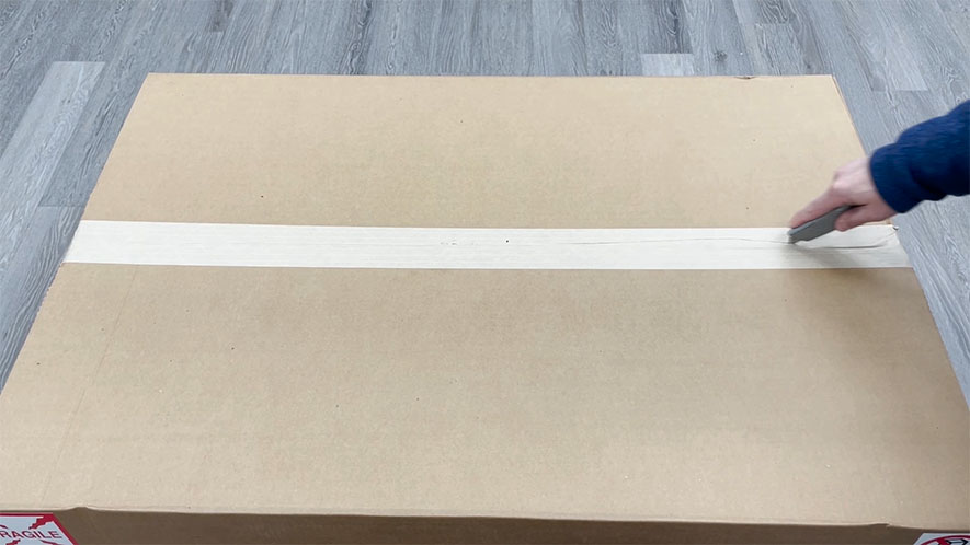 Start by using scissors or a utility knife to cut the box straps. Stand clear of the straps, as they are under high tension and may pop out at high speed when cut.