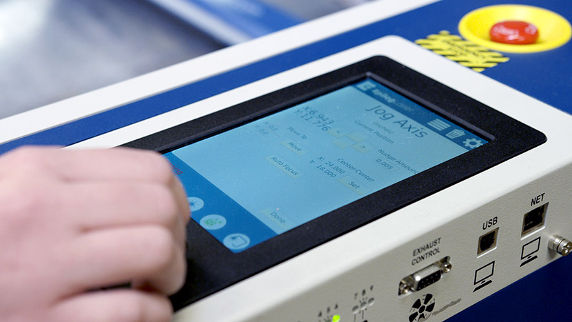Begin by Jogging the lens assembly closer to the front of the machine. To do this, select the Jog Menu icon, then use the joystick to move the lens assembly.