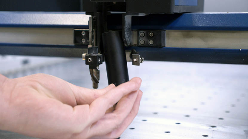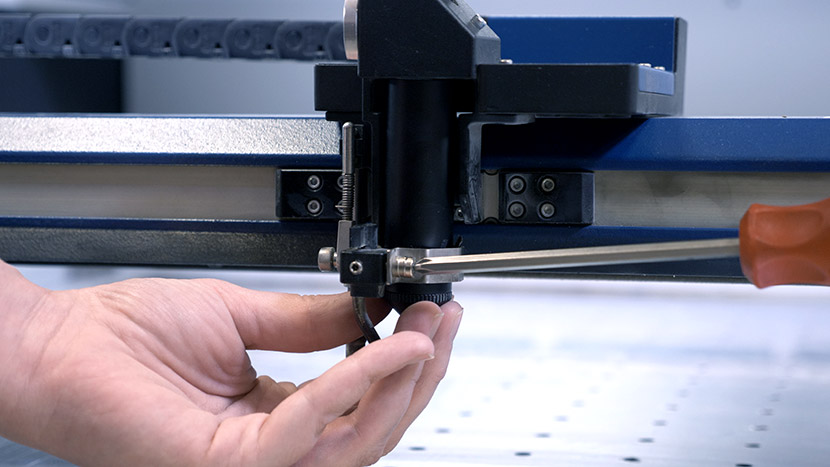 Lower the table a few inches to give you some clearance to work. You can accomplish this by selecting the Focus Menu icon, then pulling the joystick toward the front of the machine to move the table down.