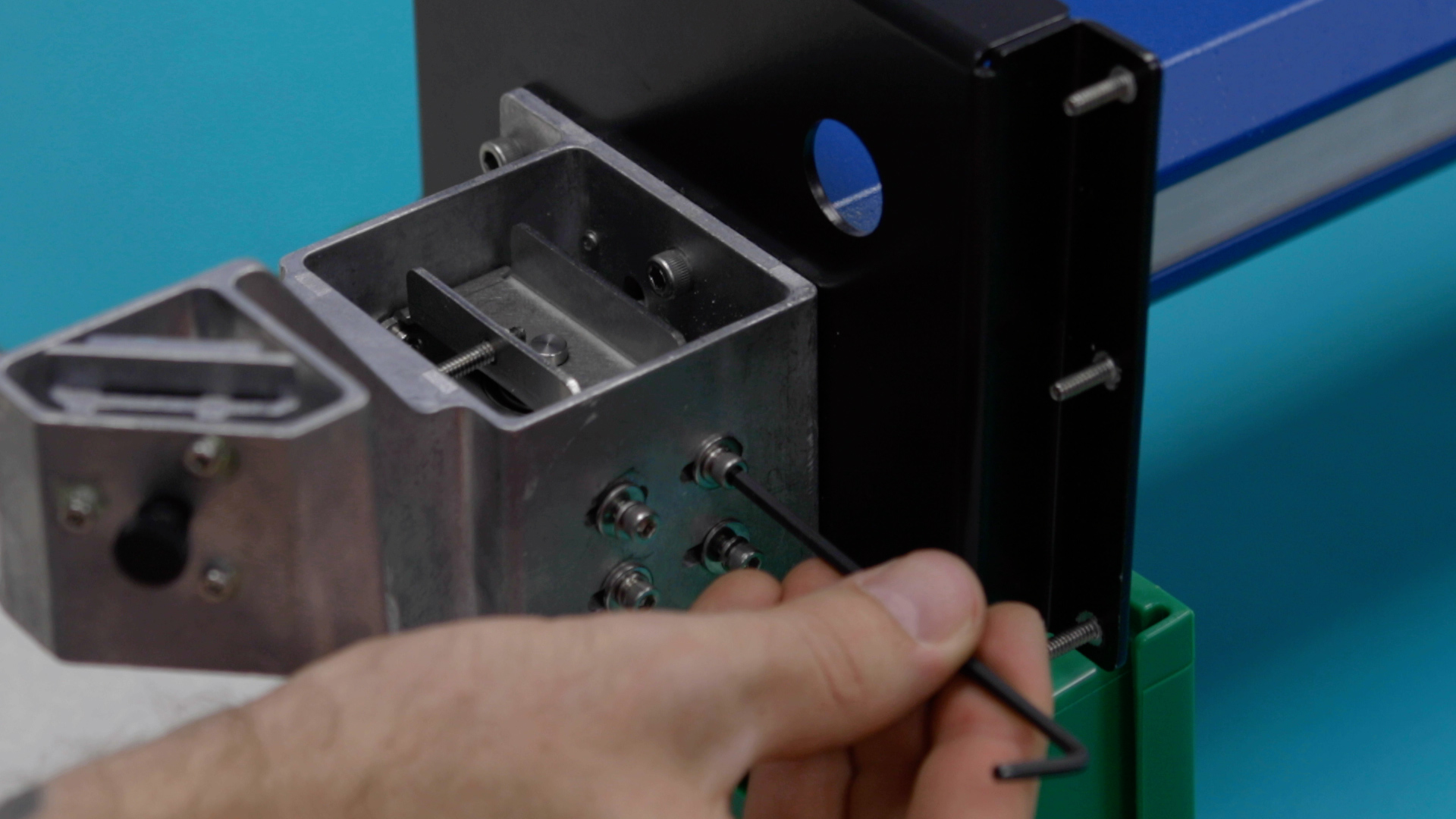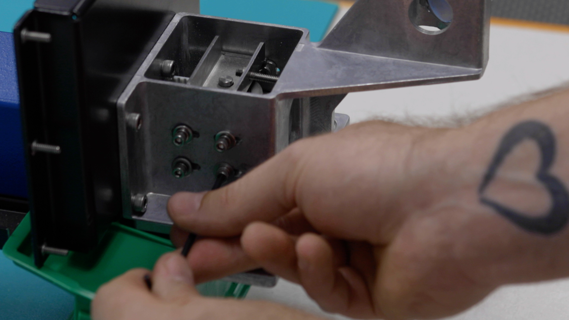 Place the belt clamps in position. Install and tighten the four 3/32” inner x-axis belt clamp mounting screws.