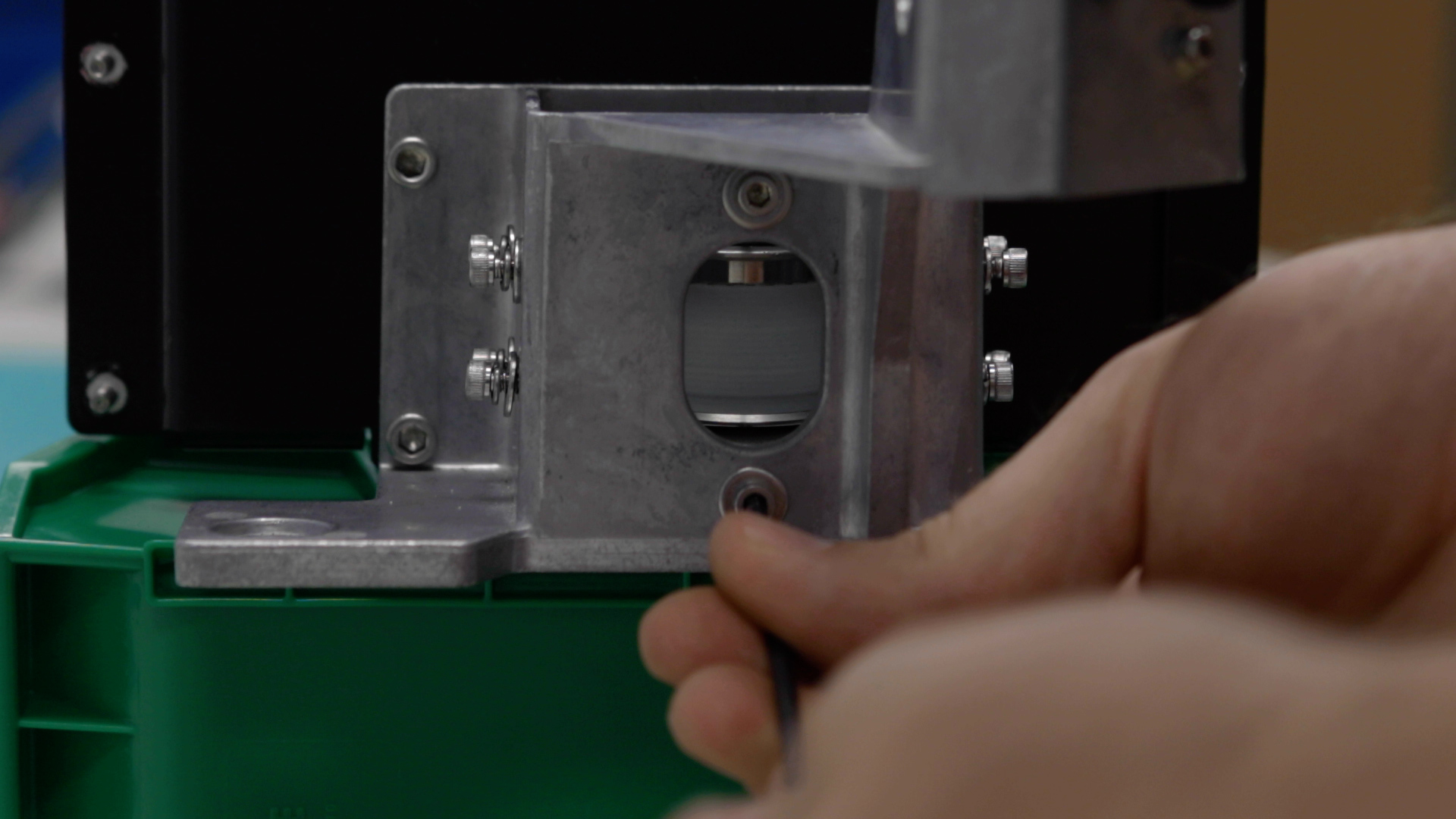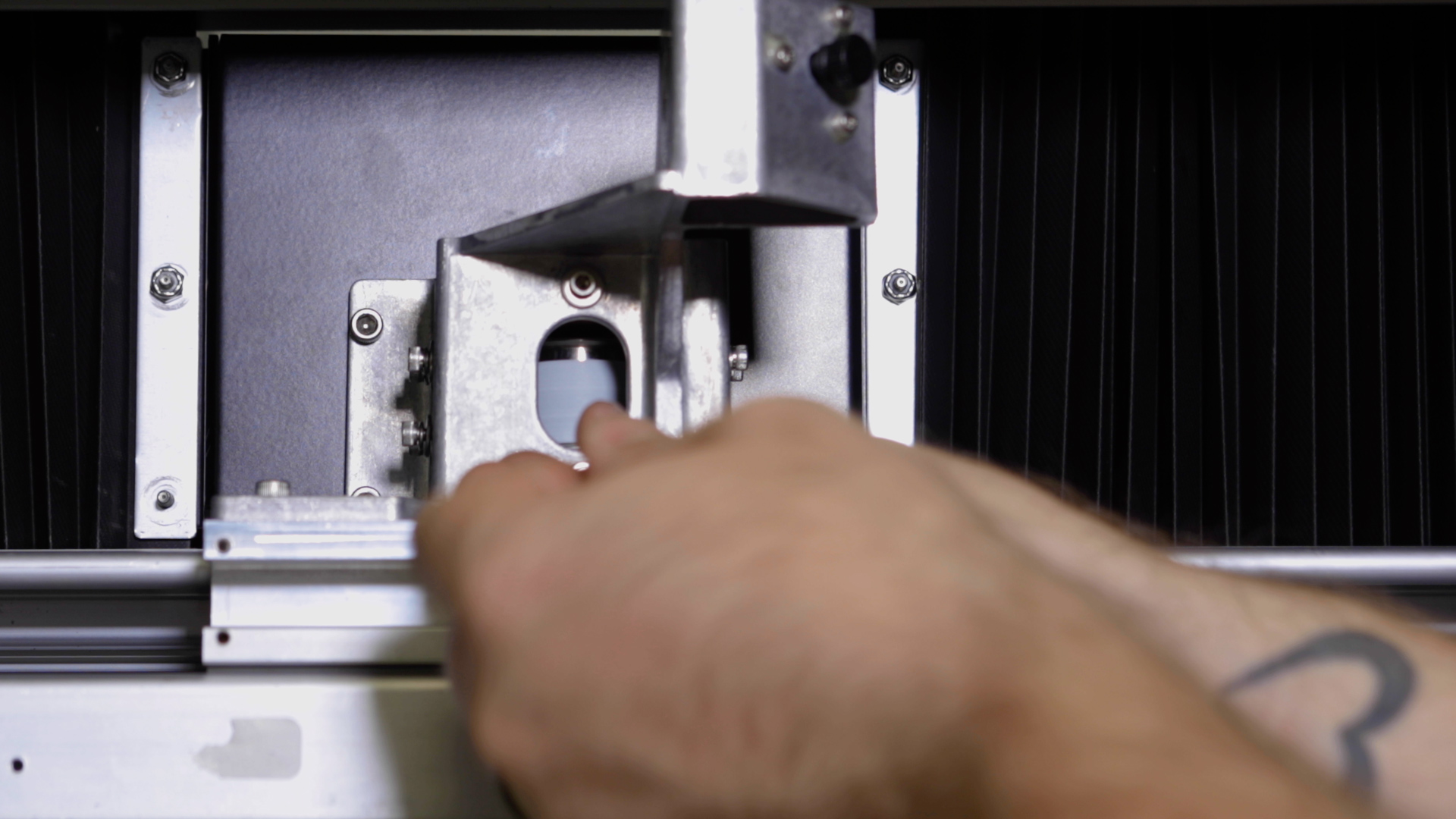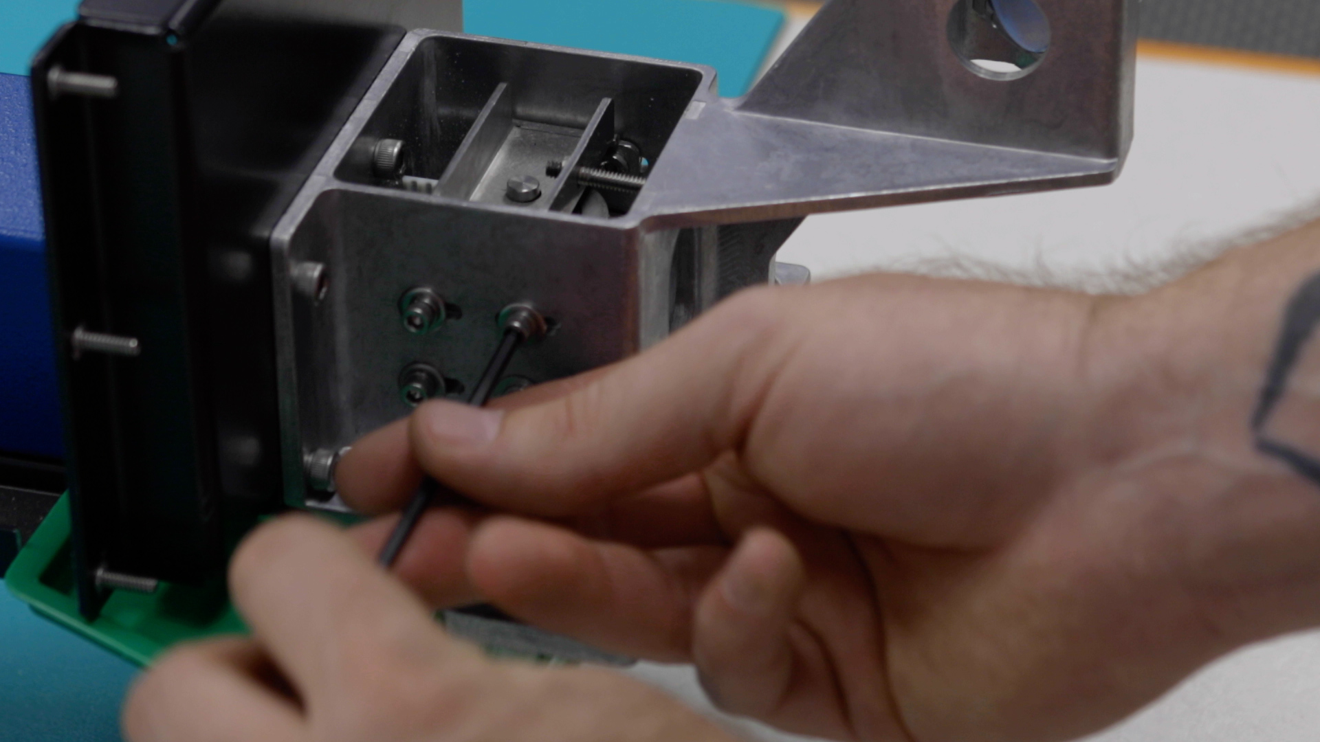 Now it’s time to tension the X-axis belt. Begin to apply tension to the X-axis belt via the two 7/64” x-axis belt tensioning screws that were loosened earlier until there is no slack left on the belt.