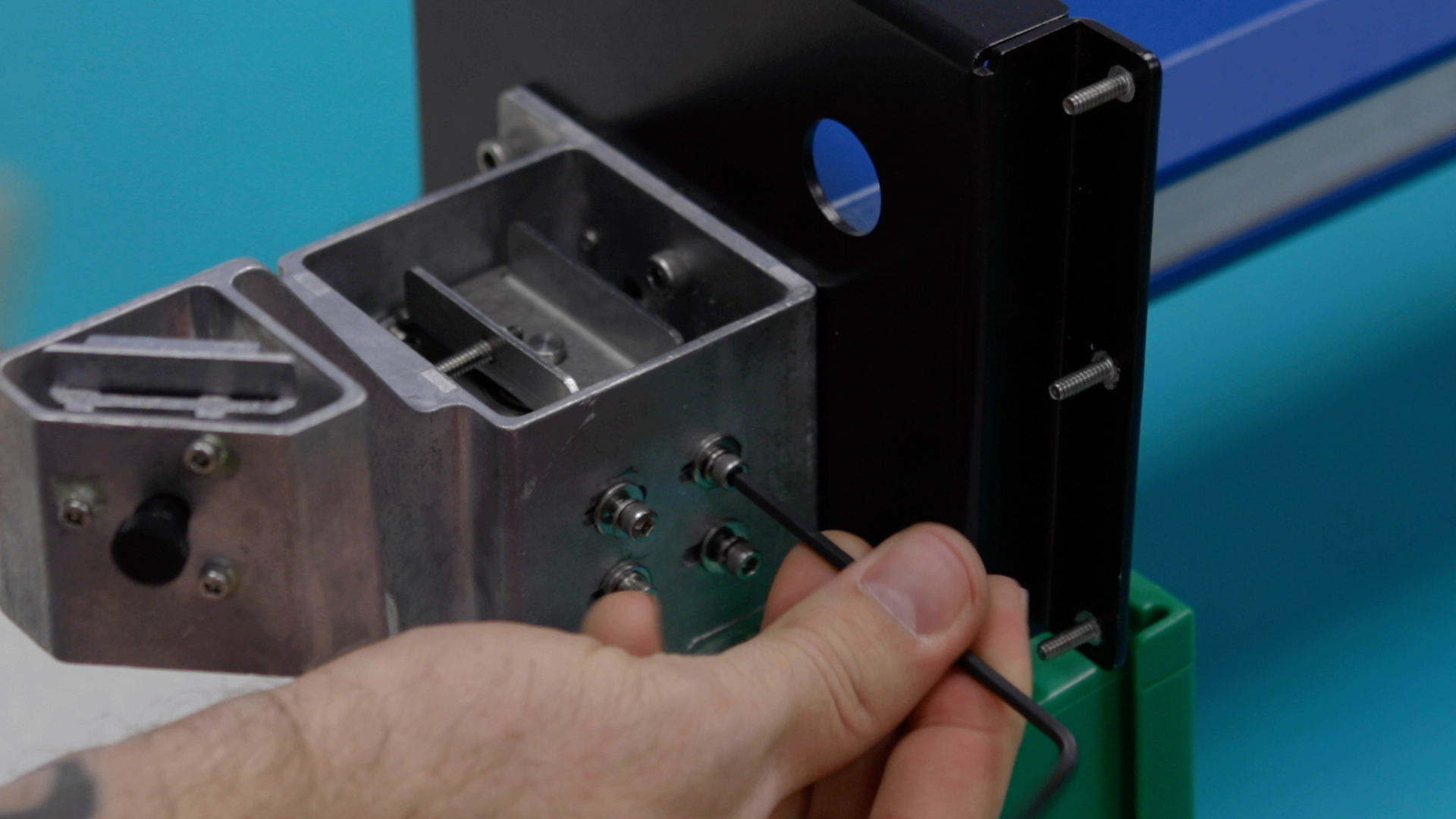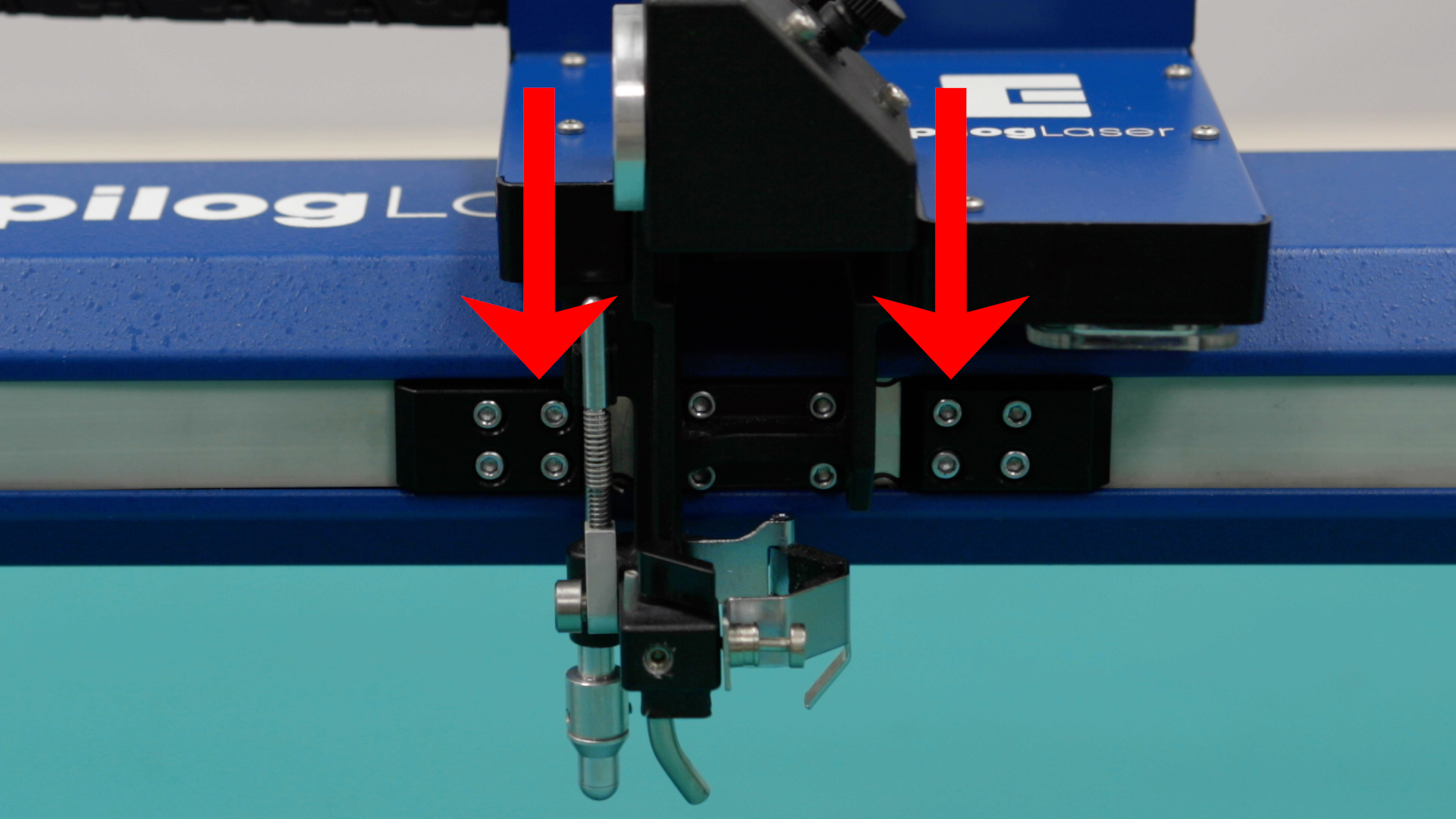 Locate the x-axis belt clamps, just to the left and right side of the lens carriage assembly. Using a 3/32” Allen key, remove the four inner x-axis belt clamp mounting screws.