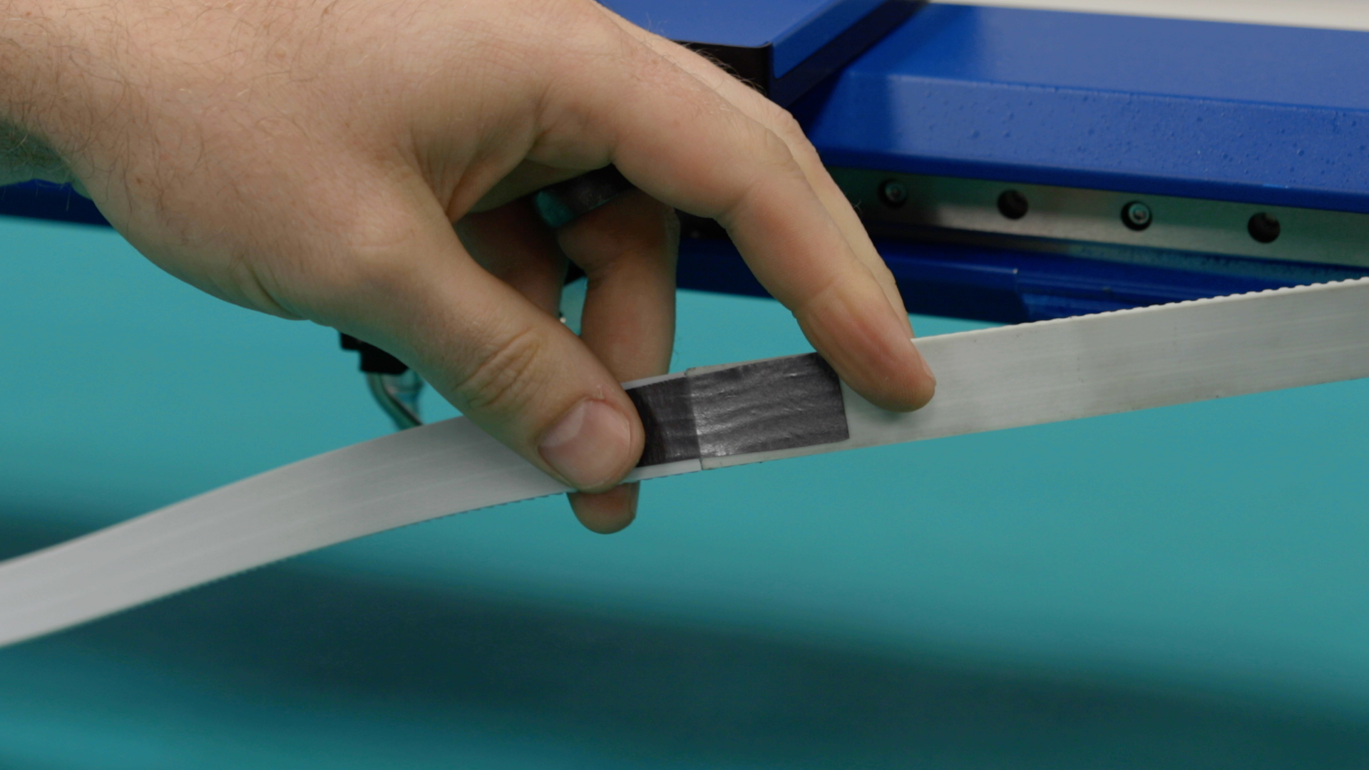 Once the new and old belts have been joined together, attach the right-side belt clamp to the untaped side of the new belt. This will prevent the new belt from being pulled into the reducer housing.