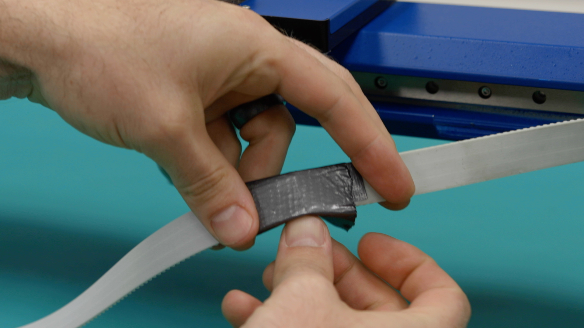 Once the connection point between the new and old belts has exited the idler assembly on the left side of the x-axis assembly, disconnect the belts by removing the tape.
