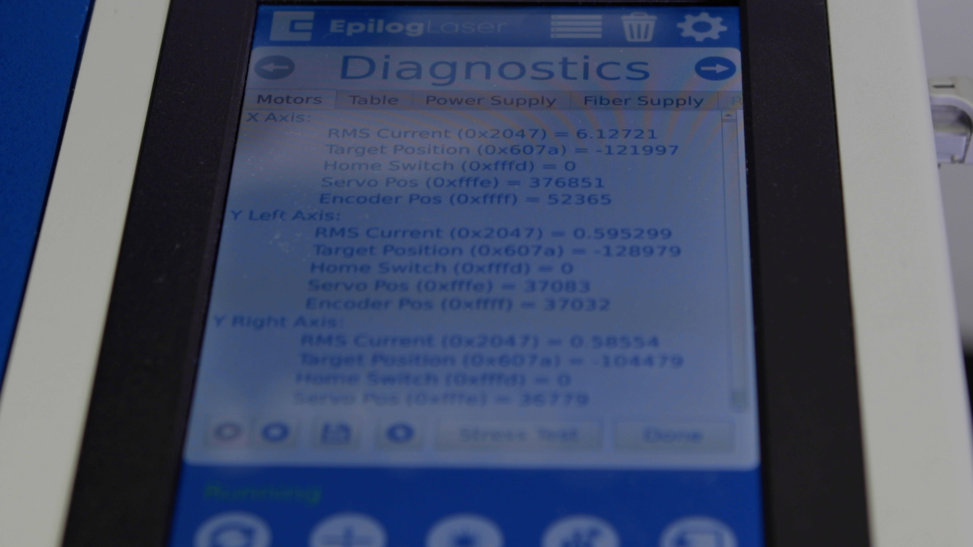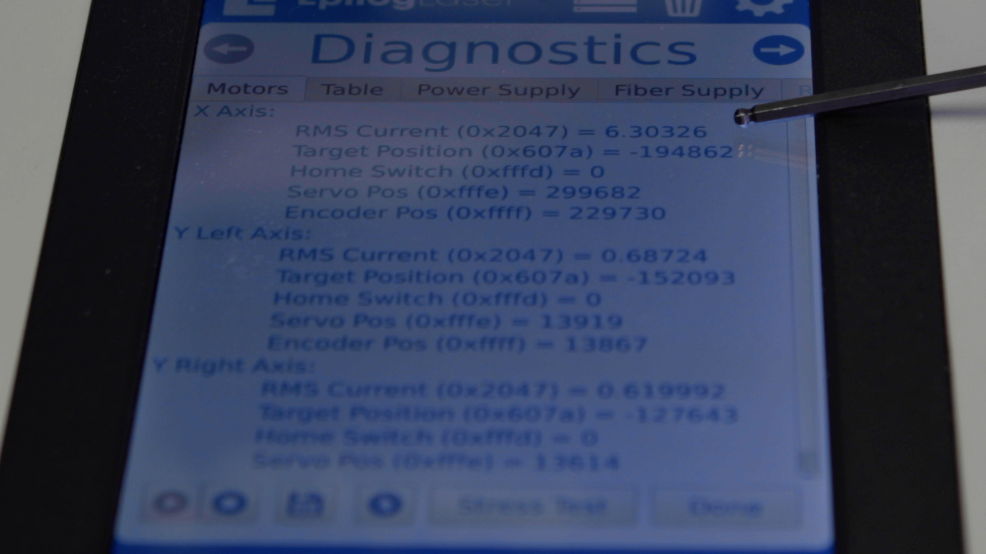 Once in the Advanced Settings menu, enter the Diagnostics menu and locate the RMS Current reading for the X-Axis Motor/Drive.