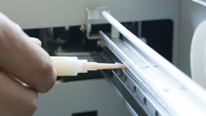 Using a cotton swab to clean the front of the linear encoder strip.Using a cotton swab to clean the back of the linear encoder strip.