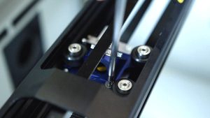 Move to the right side and loosely install the front green captive screw. Move the rail to the rear of the machine and install the remaining green captive screw. Tighten all four screws, but make sure to not over-tighten them.